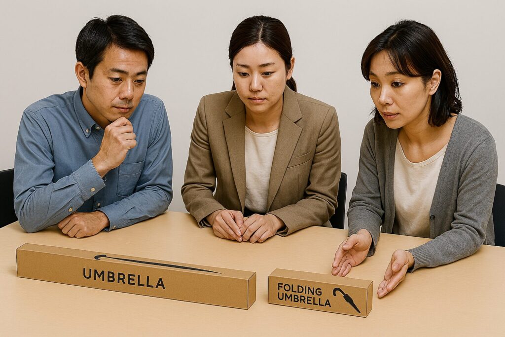 また、折りたたみ傘も長傘もそれぞれのタイプ間でも、大きさ(長さ)が種類によってさまざまあるため汎用性を持たせようとすることも検討しなければなりません。