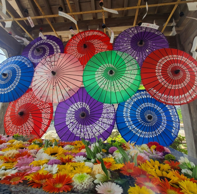 透明傘も実用的ですが、写真映えや風情を求める方には、和色に近いトーンの傘がしっとりと合います。